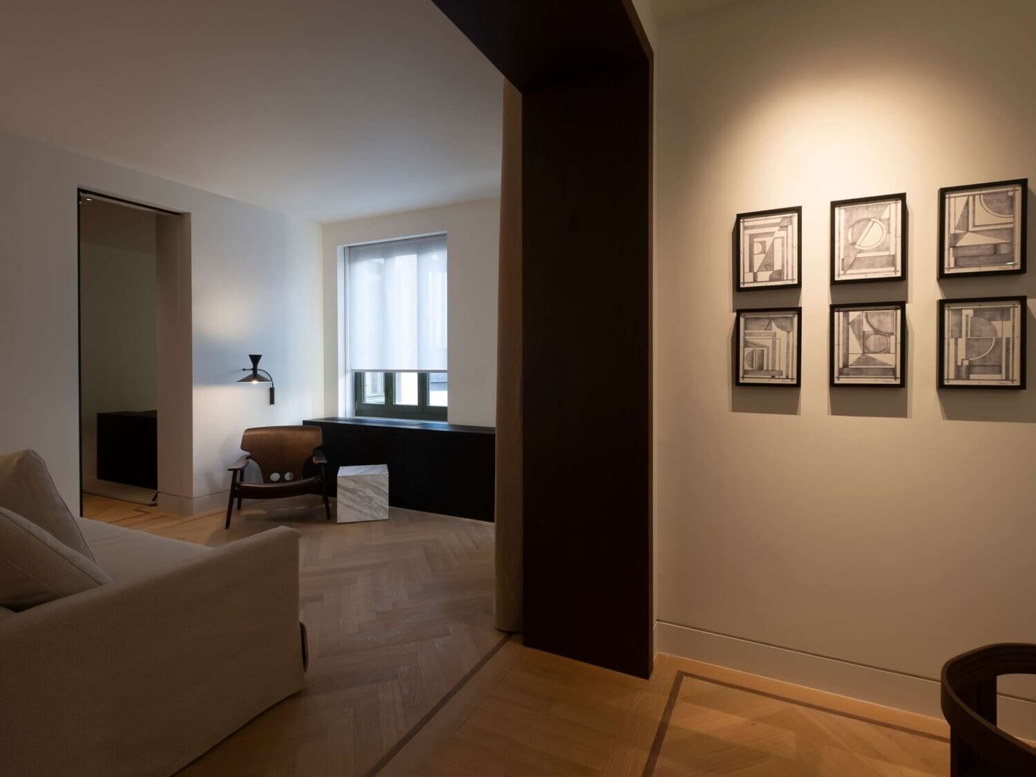 Τα υψηλά ταβάνια προσδίδουν μία αίσθηση ελευθερίας, ενώ τα μεγάλα παράθυρα επιτρέπουν στο φυσικό φως να αγκαλιάζει τον χώρο. Οι προσεγμένες λεπτομέρειες – από έργα τέχνης που αφηγούνται την ιστορία σπουδαίων Ελλήνων, μέχρι το λευκό μάρμαρο που παραπέμπει στον Παρθενώνα – προσδίδουν στις σουίτες μία αυθεντική αθηναϊκή ταυτότητα. Η Προεδρική Σουίτα αποτελεί την απόλυτη έκφραση πολυτέλειας. Εκτείνεται σε δύο επίπεδα, διαθέτει δύο υπνοδωμάτια, δύο en-suite μπάνια και μία ιδιωτική rooftop βεράντα, ιδανική για προσωπικές στιγμές ή ιδιωτικές εκδηλώσεις.