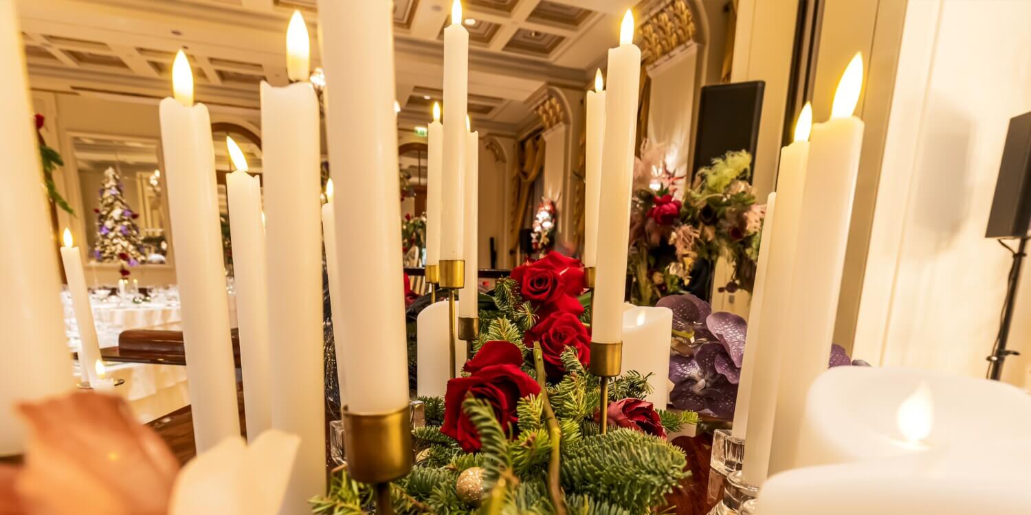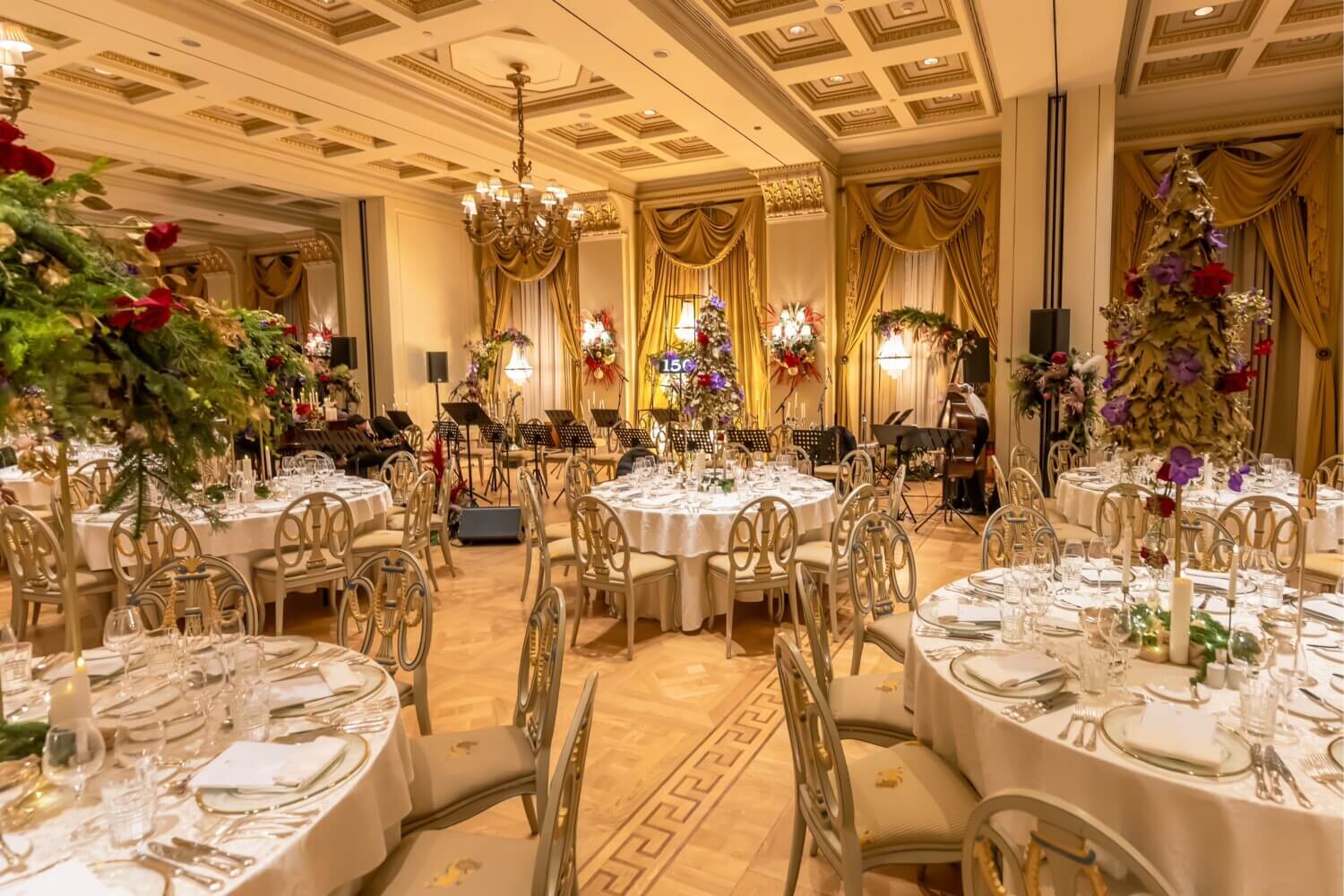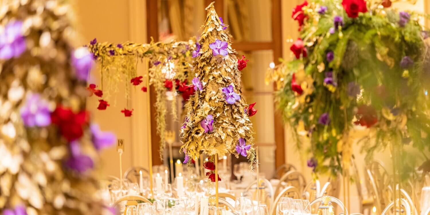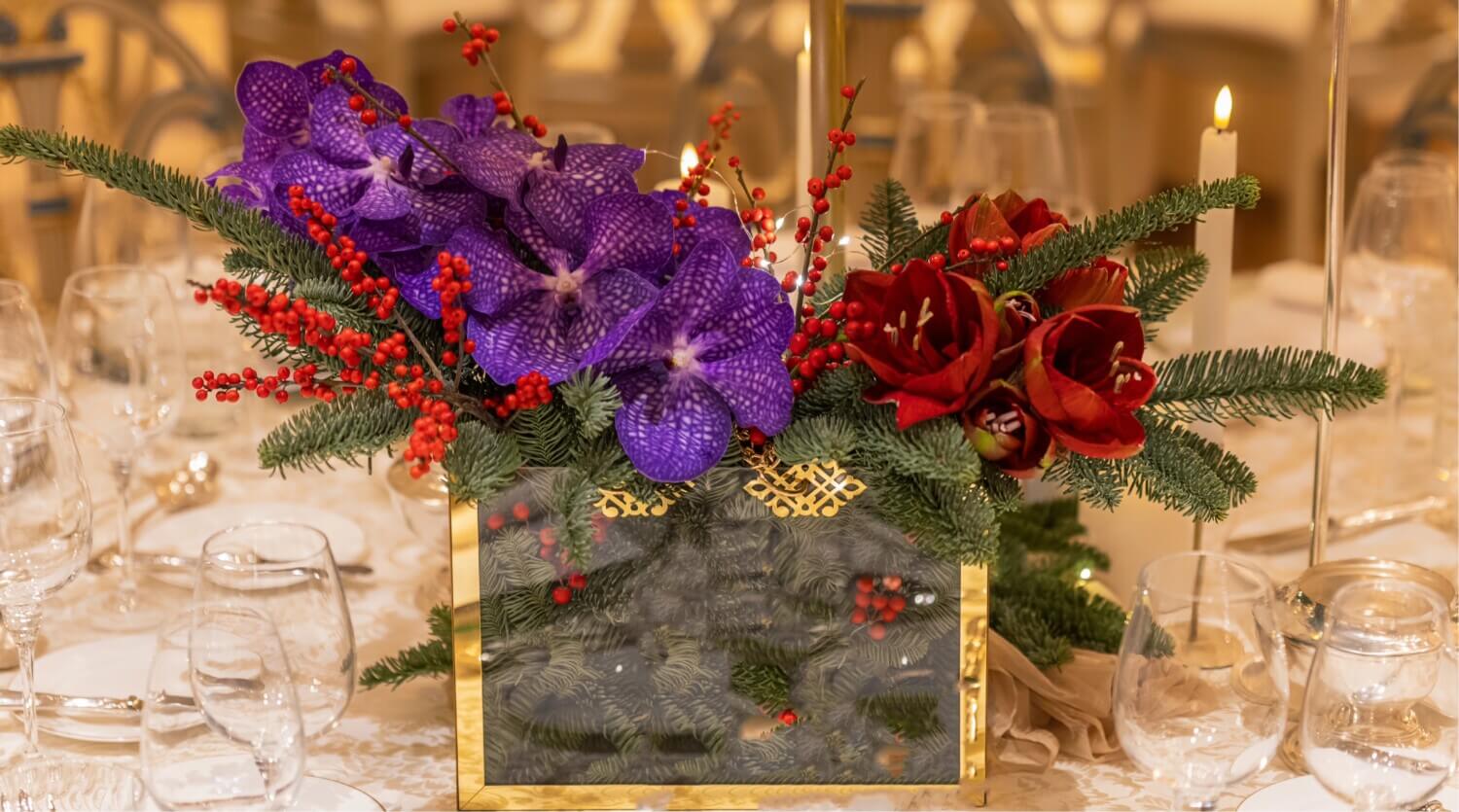 Όταν άνοιξαν οι πόρτες του Grand Ballroom, ο χώρος δεν εντυπωσίασε — αγκάλιασε. Το design κινήθηκε σε ζεστούς, τολμηρούς συνδυασμούς: μωβ ορχιδέες πλάι σε κόκκινα Baccarat τριαντάφυλλα, φωτισμοί που ανέδειξαν την αρχιτεκτονική χωρίς να την καπελώσουν, και ένα art de la table που σχεδιάστηκε όπως μια παρτιτούρα: τίποτα περιττό, τίποτα τυχαίο.