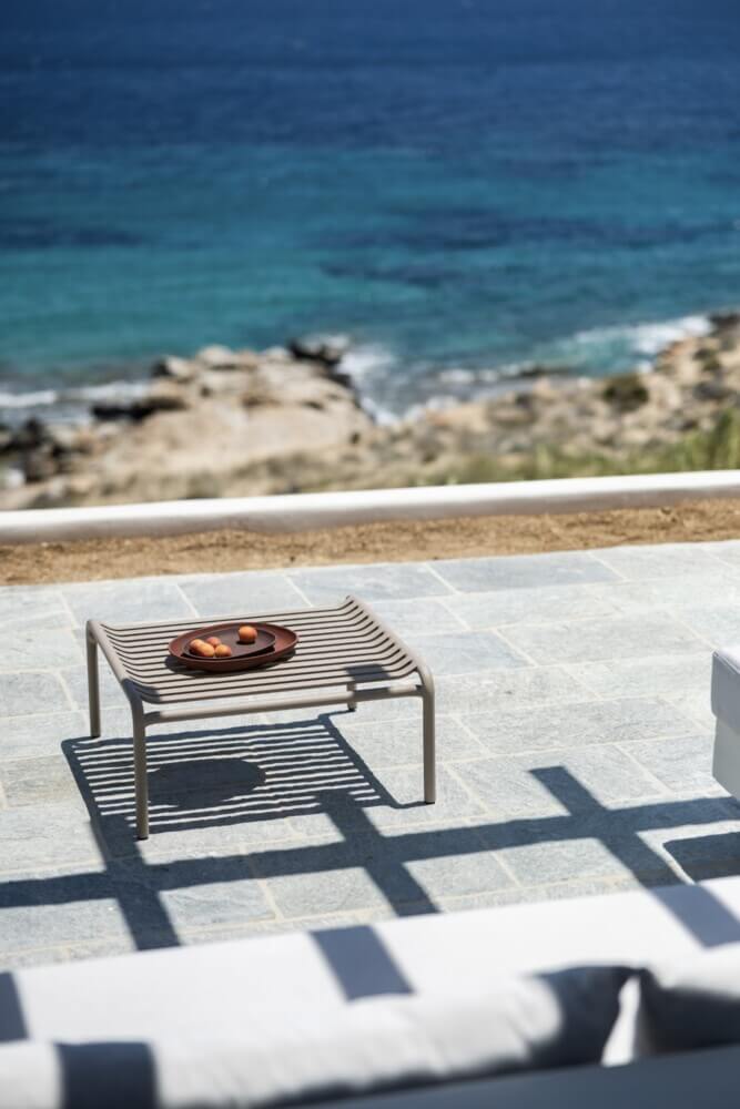 Δεν το πάμε στο άλλο άκρο να φτιάξουμε αχανείς δρόμους, τεράστιες πισίνες κλπ.. Δημιουργήσαμε ωραία περάσματα, ενδιαφέρουσες υφές, άνετα καθίσματα με τοποθέτηση προκειμένου όπου κάθεσαι να ξαπλώσεις να έχεις οπτική, συνεχίσαμε τη χρωματική παλέτα του έξω για να υπάρχει η αίσθηση συνέχειας.