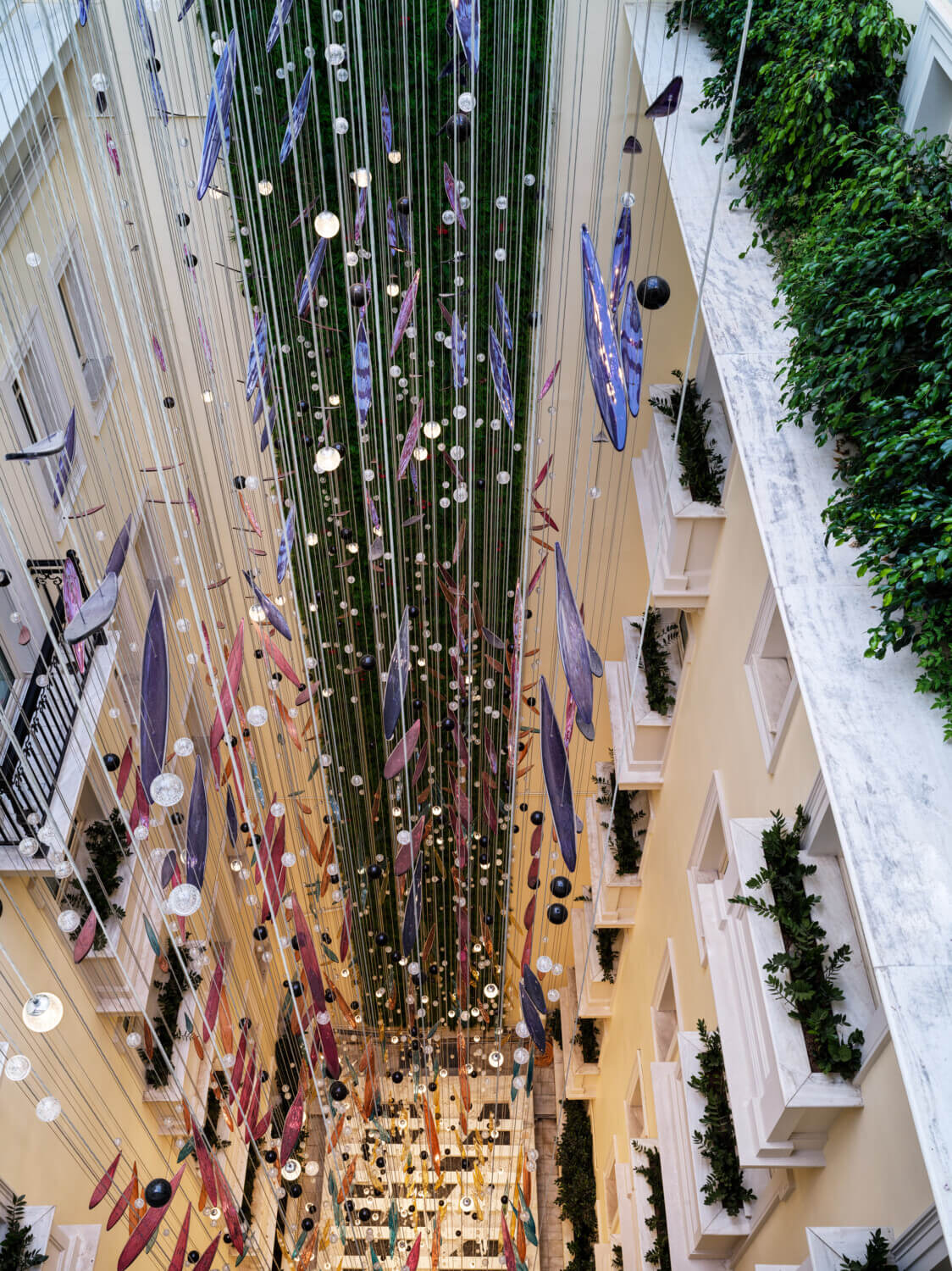 Στη θέα του μοναδικού αυτού γυάλινου έργου οι επισκέπτες του Ξενοδοχείου King George βιώνουν μια ασύγκριτη εμπειρία αισθήσεων, η οποία σηματοδοτεί μια κομβική στιγμή στην πορεία του ξενοδοχείου, ενισχύοντας τη δέσμευσή του να προάγει ένα περιβάλλον όπου η τέχνη και η πολυτέλεια συνυπάρχουν αρμονικά σε ένα ποιητικό αφήγημα. Tο λόμπι του ιστορικού Ξενοδοχείου King George, που βρίσκεται δίπλα στο εμβληματικό και πλέον 150 ετών Ξενοδοχείο Μεγάλη Βρεταννία, ήδη κοσμούν ένα καλαίσθητο μαρμάρινο πάτωμα με διακοσμητικά στοιχεία από φύλλα ελιάς και έργα τέχνης υψηλής αξίας.