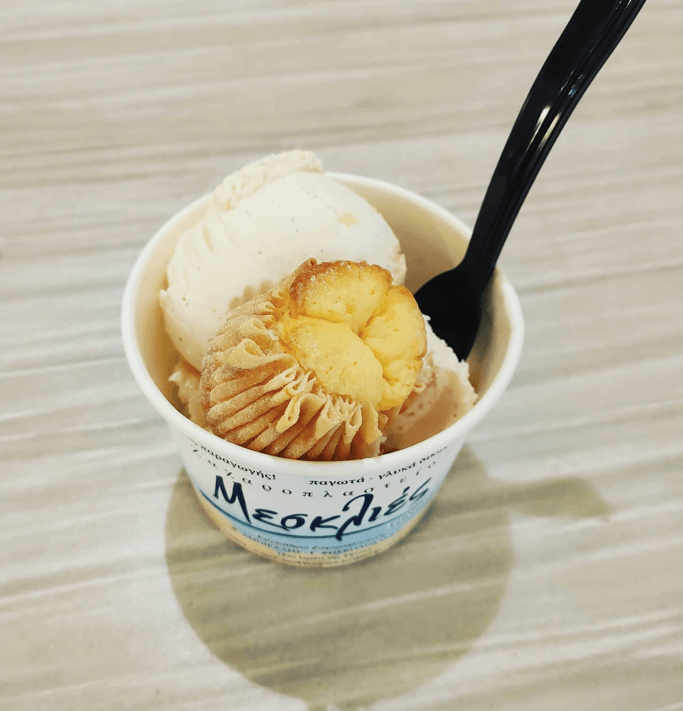 Στο κατάστημα του κοντά στο λιμάνι της Χώρας της Τήνου βρίσκουμε όλα τα παραπάνω, αλλά και τις πιο σύγχρονες και δημιουργικές παραλλαγές, όπως το παγωτό με γεύση τηνιακή τυρόπιτα. Απολαμβάνουμε επί τόπου δίπλα στη θάλασσα την πάστα μας στα τραπεζάκια του όπως παλιά και προμηθευόμαστε γεύσεις γλυκές στα μπλε του κουτιά για το σπίτι.
