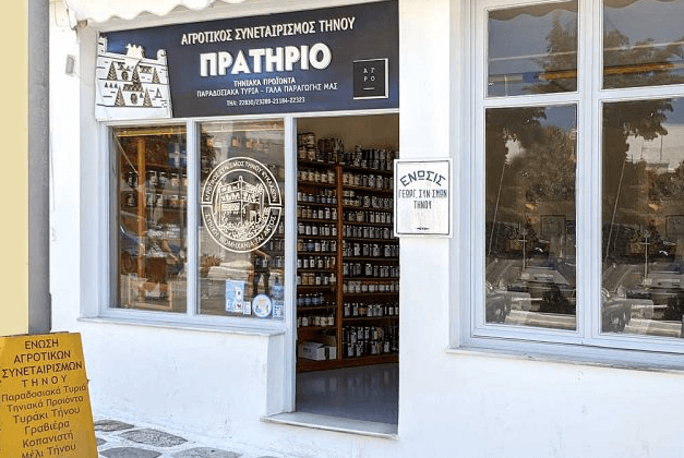 Αν αναζητούμε αυθεντικές γεύσεις της Τήνου όπως το τυρί βολάκι, το καρίκι αλλά και τη γραβιέρα της Τήνου, τα κρασιά που φτιάχνονται στο νησί από τοπικές ποικιλίες, τις ξυδάτες αγκινάρες και τις μαρμελάδες που φτιάχνουν οι μαγείρισσες των Κυκλάδων χρησιμοποιώντας υλικά από τα μποστανάκια τους, τότε δεν έχουμε παρά να βρεθούμε στο  μικρό Πρατήριο Τηνιακών Προϊόντων του Αγροτικού Συνεταιρισμού Τήνου