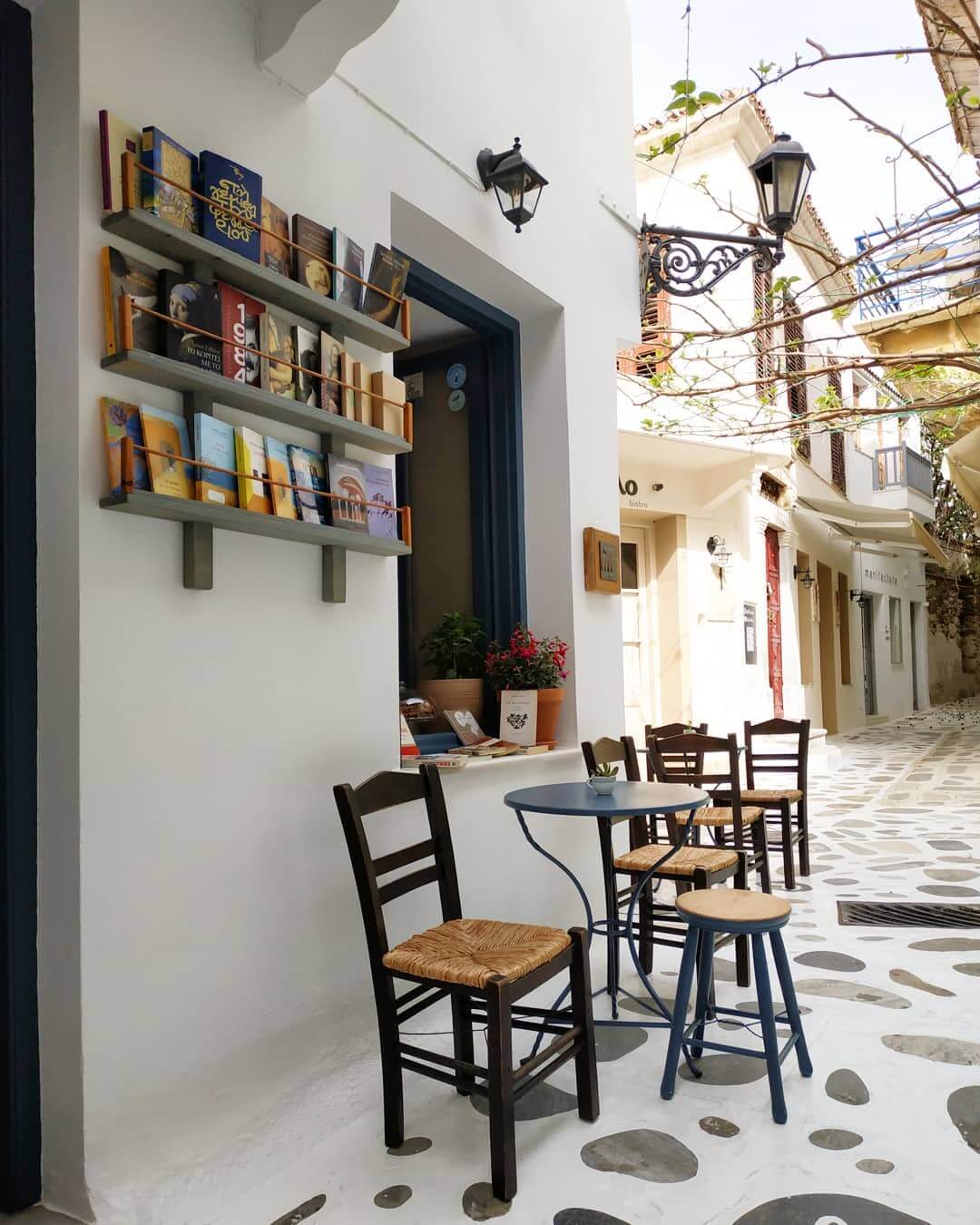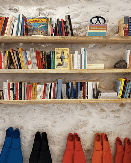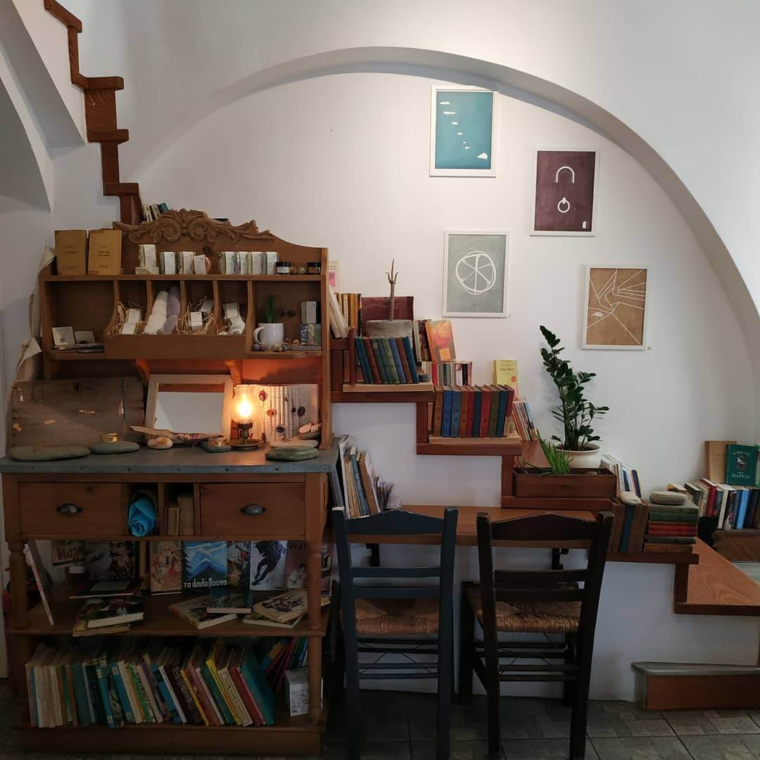 Θυμίζοντας κάτι ανάμεσα σε νησιώτικο σπίτι με μια πλούσια συλλογή βιβλίων και περιποιημένο παιδικό βιβλιοπωλείο με το εσωτερικό νησιώτικο βόλτο να χωρίζει ή καλύτερα ενώνει τον χώρο του διαθέτει πολλαπλές γωνιές και ράφια με μια πλούσια ποικιλία τίτλων από λογοτεχνία και best sellers, μέχρι ψαγμένες εκδόσεις με ποιητικές συλλογές. Αλλά και βιβλία και οδηγούς που μας μιλούν για τα ταξίδια μέχρι ιδιαίτερα παιδικά βιβλία και πολύχρωμες εκδόσεις που μελλοντικά θα μετατραπούν σε ενθύμιο των διακοπών στην όμορφη Σύρο.