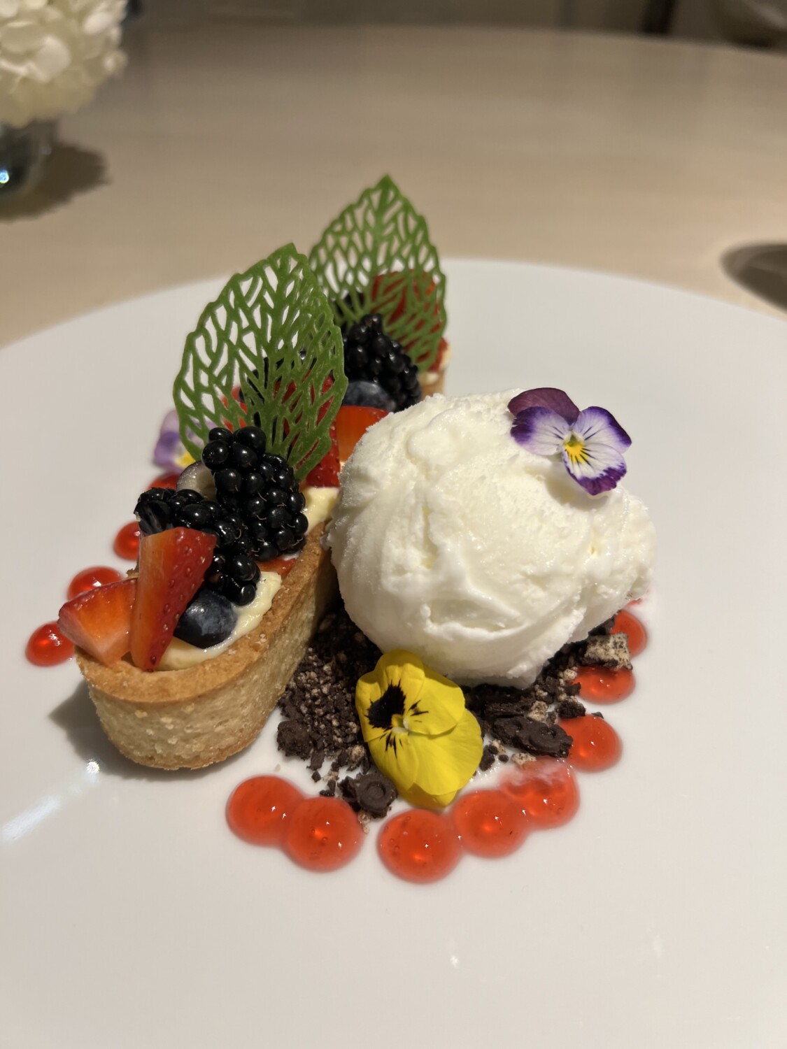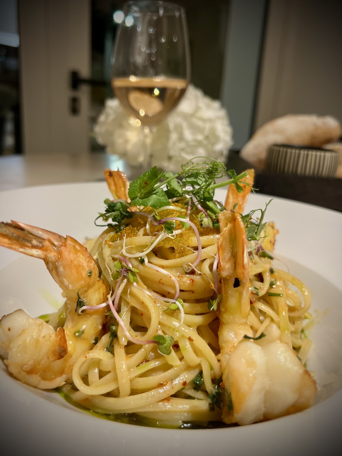Το sea bass tartare με lime, mango, ginger και chili pepper μου κέντρισε το ενδιαφέρον από την πρώτη στιγμή. Δροσερό, γευστικό,εξωτικό, ότι έπρεπε για την ώρα του ηλιοβασιλέματος συντροφιά με ένα ποτήρι παγωμένο κρασί. Για κυρίως πιάτο διάλεξα Linguine Aglio e olio με γαρίδες. Όσον αφορά το επιδόρπιο απόλαυσα την τάρτα με κόκκινα φρούτα και παγωτό βανίλια. Για ακόμα μια φορά ο Θέμης Χαρδαβέλλας (pastry chef ομίλου Grecotel) βάζει την υπογραφή του.