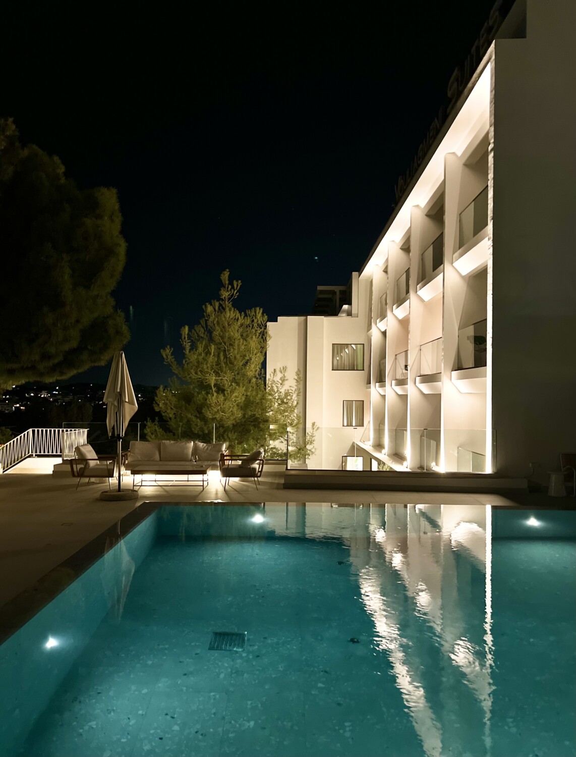 Αφού ενημερώθηκα με όλες τις πληροφορίες για την διαμονή μου, ήρθε η ώρα να ανοίξω την πόρτα του “εξοχικού μου”. Το ασανσέρ σταματά στον 3ο όροφο, δωμάτιο Νο27 και ανοίγοντας την πόρτα ο χρόνος παγώνει. Μπαίνοντας, στο δεξί χέρι το μπάνιο, θα μπορούσα να το χαρακτηρίσω και ως χώρο ευεξίας. Συνεχίζοντας ευθεία το βλέμμα μου το καθήλωσε η θέα που κάδραρε η τεράστια τζαμαρία. Τα χρώματα που βλέπεις είναι το μπλε και το πράσινο! Σε ένα πρώτο επίπεδο το βλέμμα μου συναντά το πράσινο των πεύκων και σε ένα δεύτερο το αστείρευτο μπλε της θάλασσας στην Αθηναϊκή Ριβιέρα.