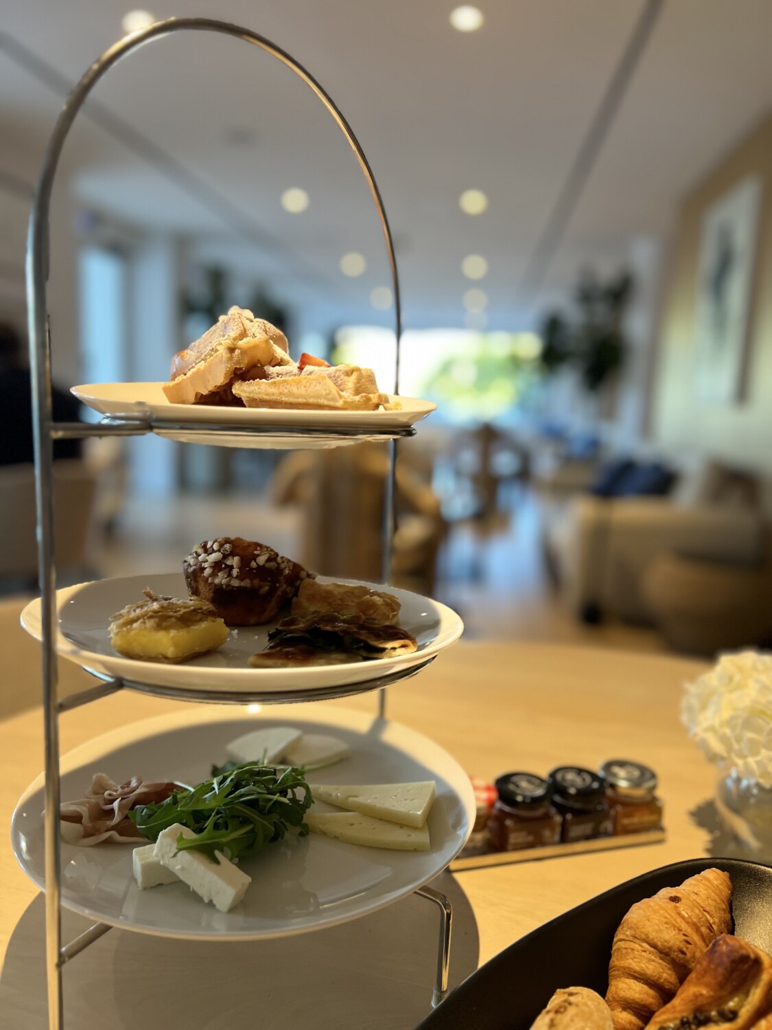 Στο Roc Club το κομμάτι dinning μοιράζεται σε δύο μέρη, στο The Roc Veranda και στο The Roc Roof Top. Απόλαυσα το πρωινό μου στην βεράντα υπό την σκιά των πεύκων και εκείνο το γλυκό αεράκι του Οκτωβρίου. Κατέφθασε μια τριώροφη ορντεβιέρα γεμάτη ελληνικά καλούδια, κρητικά μαραθοπιτάκια, γραβιέρα κρήτης, χειροποίητη τυρόπιτα και μπουγάτσα με αφράτη κρέμα. Το μενού με τα ζεστά πιάτα είναι Α La carte και μπορείς να διαλέξεις ανάμεσα σε πολλές επιλογές όπως avocado toast, στραπατσάδα με φέτα, eggs benedict με σολομό κλπ. Στον μπουφέ που δεν είναι ο κλασικός μπουφές όπως τον έχετε στο μυαλό σας…. παράλληλα με το μπαρ υπάρχει ένα δεύτερο επίπεδο με μαρμάρινη επιφάνεια που φιλοξενεί φρέσκους χυμούς, φρούτα, δημητριακά καθώς και πολλές επιλογές για λάτρεις του wellness lifestyle.